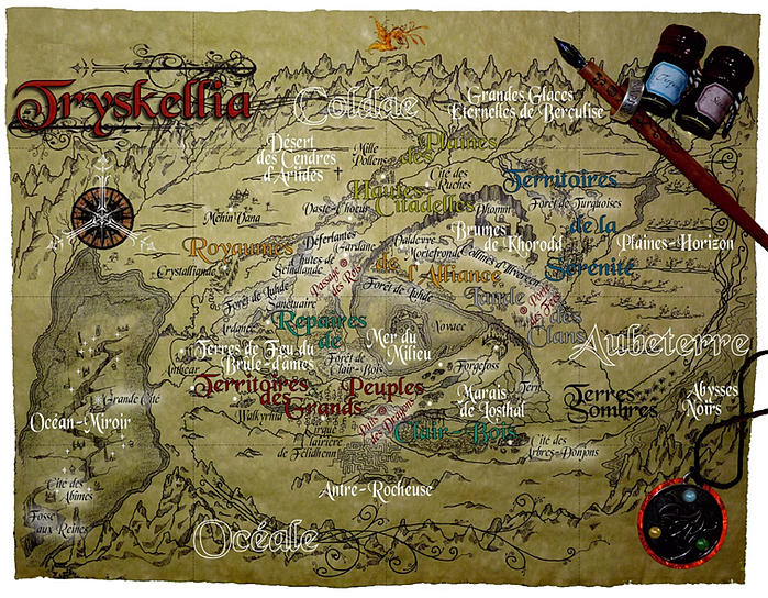 Tryskellia, terre en perdition, où de nombreux peuples tentent l’harmonie, après des guerres affreuses et tueuses. Les noirs desseins, que l’on croyait engloutis dans un désert de brume, se relèvent et viennent, au jour de leur dix ans, assaillir deux princesses. La quête qui s’en suit ralliera à nouveau les peuplades éparses... Mais pourquoi tout cela nous est-il raconté aujourd’hui, par cette drôle de petite femme ?